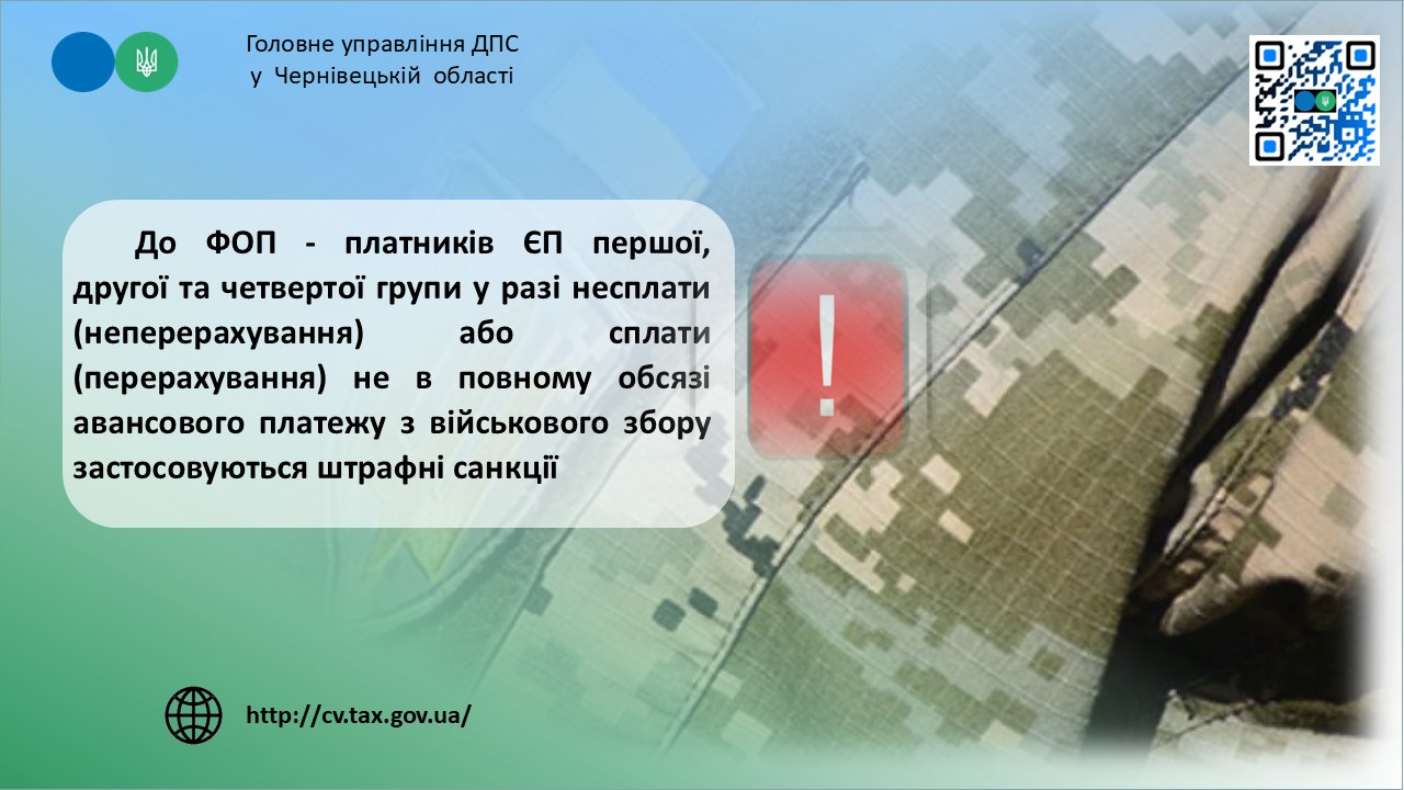 Фахівці Головного управління ДПС у Чернівецькій області звертають увагу, що відповідно до п.п. 2 п.п. 1.1 п. 16 прим. 1 підрозд. 10 розд. XX «Перехідні положення» Податкового кодексу України від 02 грудня 2010 року № 2755-VI (далі – ПКУ) платниками військового збору фізичні особи – підприємці – платники єдиного податку першої, другої та четвертої групи.