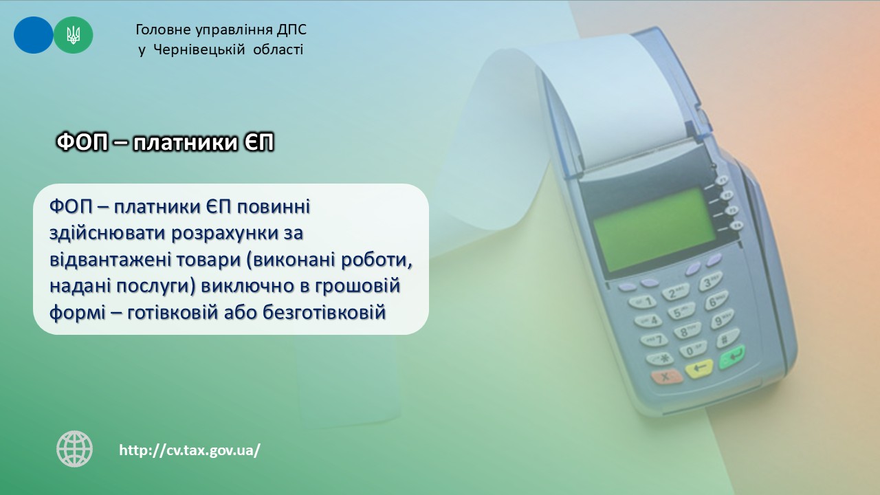 У Головному управлінні ДПС у Чернівецькій області звертають увагу ФОП – платників ЄП, що відповідно до п. 291.6 ст. 291 Податкового кодексу України платники єдиного податку першої – третьої груп повинні здійснювати розрахунки за відвантажені товари (виконані роботи, надані послуги) виключно в грошовій формі – готівковій або безготівковій (у тому числі з використанням електронних грошей).