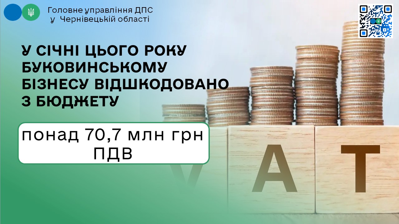 Представникам бізнесу, з врахуванням залишку невідшкодованого податку на додану вартість ПДВ, у січні 2026 року фактично відшкодовано на розрахункові рахунки понад 70,7 млн грн.
