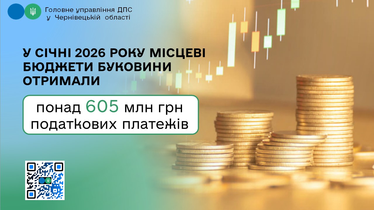 За підсумками січня 2026 року платниками податків до місцевих бюджетів спрямовано 605,02 млн грн, що перевищило на 104,3 млн грн (+ 20,8 відсотків) факту січня минулого року – акцентує начальник Головного управління ДПС у Чернівецькій області Микола Загарюк.