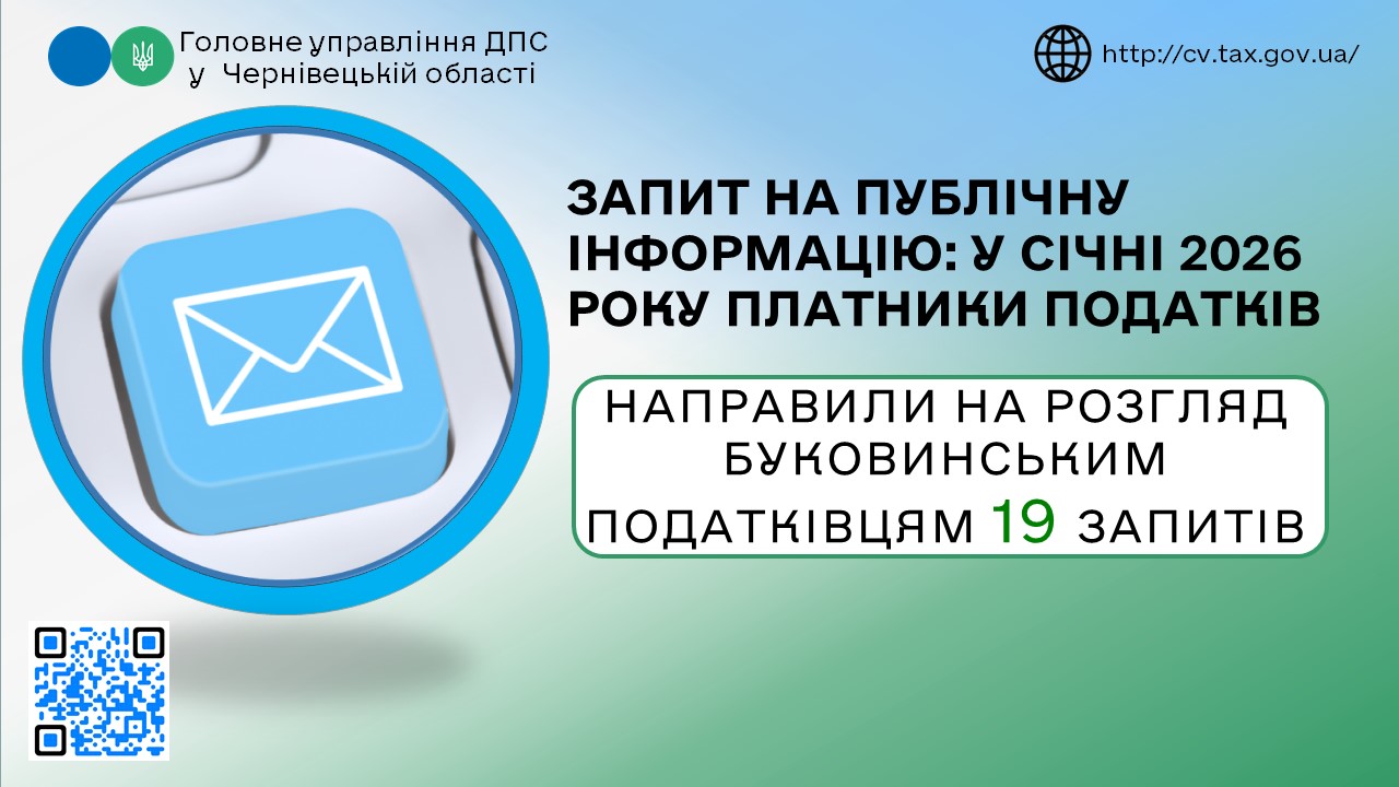У Головному управлінні ДПС у Чернівецькій області інформують, у січні 2026 року правом на отримання інформації, якою володіє податкова служба області скористались 19 платників податків. З них, 12 надійшло поштою та  7 запитів платники направили електронною поштою.