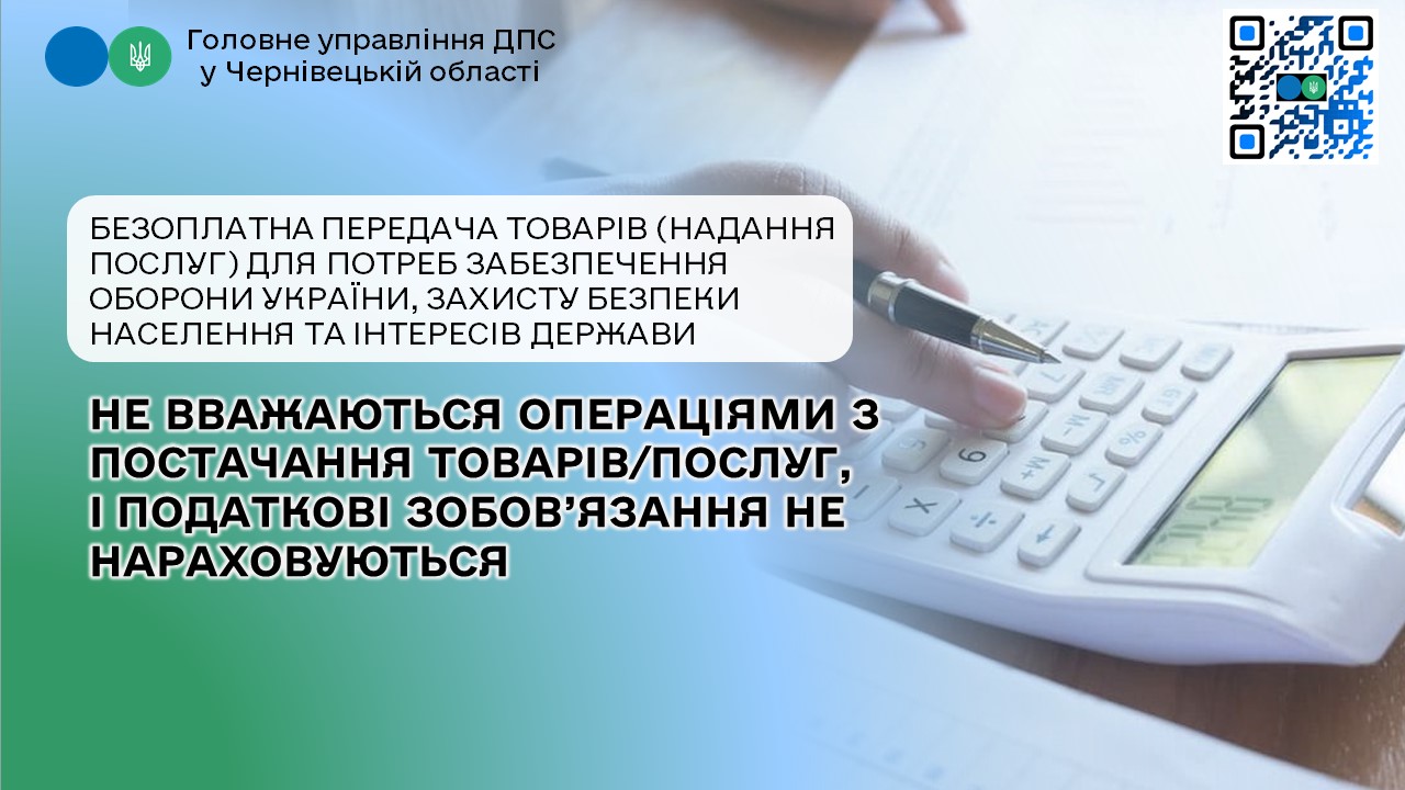 У Головному управлінні ДПС у Чернівецькій області інформують відповідно до абзацу четвертого п. 32 прим. 1 підрозд. 2 розд. ХХ Податкового кодексу України від 02 грудня 2010 року № 2755-VI (далі – ПКУ) не є постачанням товарів та послуг операції з безоплатної (без будь-якої грошової, матеріальної або інших видів компенсації) передачі/надання товарів та послуг Збройним Силам України, Національній гвардії України, Службі безпеки України, Службі зовнішньої розвідки України, Державній прикордонній службі України, Міністерству внутрішніх справ України, Державній службі України з надзвичайних ситуацій, Управлінню державної охорони України, Державній службі спеціального зв’язку та захисту інформації України, добровольчим формуванням територіальних громад, іншим утворенням відповідно до законів України військовим формуванням, їх з’єднанням, військовим частинам, підрозділам, установам або організаціям, що утримуються за рахунок коштів державного бюджету, для потреб забезпечення оборони України, захисту безпеки населення та інтересів держави, а також на користь центрального органу виконавчої влади, який забезпечує формування та реалізує державну політику у сфері цивільного захисту, сил цивільного захисту та/або закладів охорони здоров’я державної, комунальної власності, та/або структурних підрозділів з питань охорони здоров’я обласних, Київської та Севастопольської міських державних адміністрацій, крім випадків, якщо такі операції з постачання товарів та послуг оподатковуються за нульовою ставкою ПДВ.