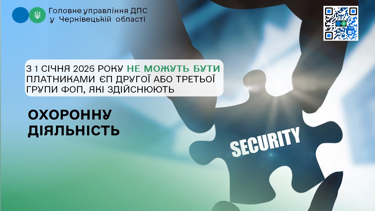 У Головному управлінні ДПС у Чернівецькій області звертають увагу, що з 1 січня 2026 року не можуть бути платниками ЄП другої або третьої групи ФОП, які здійснюють охоронну діяльність.