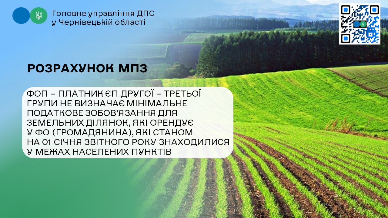 У Головному управлінні ДПС у Чернівецькій області інформують, відповідно до п.п. 14.1.114 прим. 2 п. 14.1 ст. 14 Податкового кодексу України від 02 грудня 2010 року № 2755-VI (далі – ПКУ) мінімальне податкове зобов’язання – це мінімальна величина податкового зобов’язання із сплати податків, зборів, платежів, контроль за справлянням яких покладено на контролюючі органи, пов’язаних з виробництвом та реалізацією власної сільськогосподарської продукції та/або з власністю та/або користуванням (орендою, суборендою, емфітевзисом, постійним користуванням) земельними ділянками, віднесеними до сільськогосподарських угідь, розрахована відповідно до ПКУ. Сума мінімальних податкових зобов’язань, визначених щодо кожної із земельних ділянок, право користування якими належить одній юридичній або фізичній особі, у тому числі фізичній особі – підприємцю, є загальним мінімальним податковим зобов’язанням.