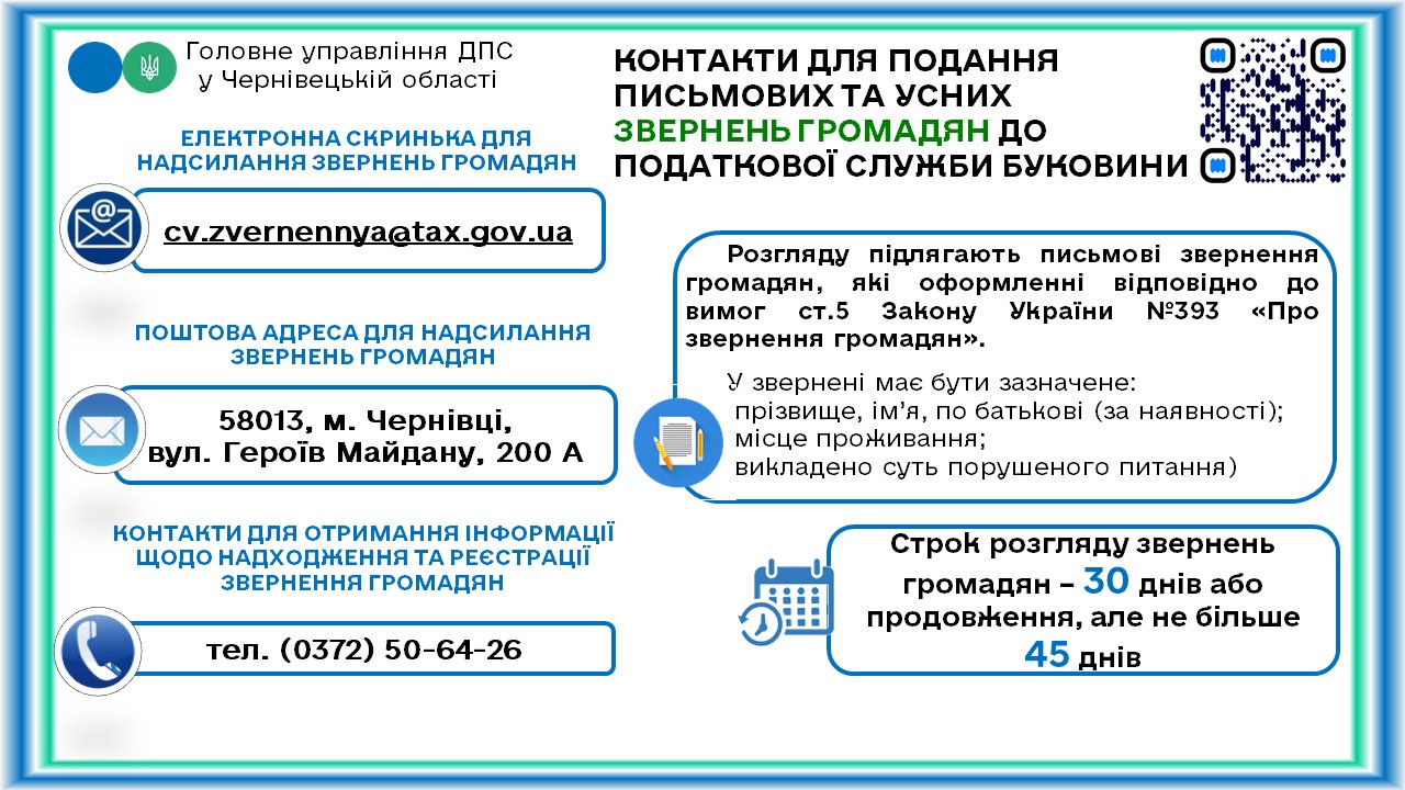 Контакти для подання письмових та усних звернень до Головного управління ДПС у Чернівецькій області