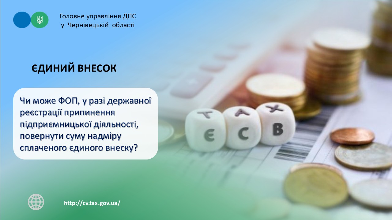Таким чином, фізична особа – підприємець, у разі державної реєстрації припинення підприємницької діяльності, має можливість повернути суму надміру сплаченого єдиного внеску на підставі заяви, яка подається до дати зняття з обліку такого платника.
