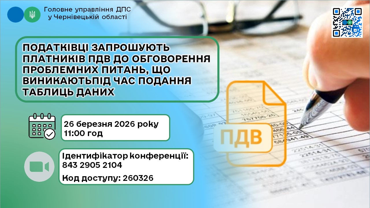 Головне управління ДПС у Чернівецькій області проведе в режимі ZOOM конференцію на тему: «Удосконалення процедур подання та розгляду таблиць даних платника ПДВ. Обговорення ініціатив ДПС з формування Єдиного каталогу типових таблиць даних платника ПДВ у виробничій галузі».