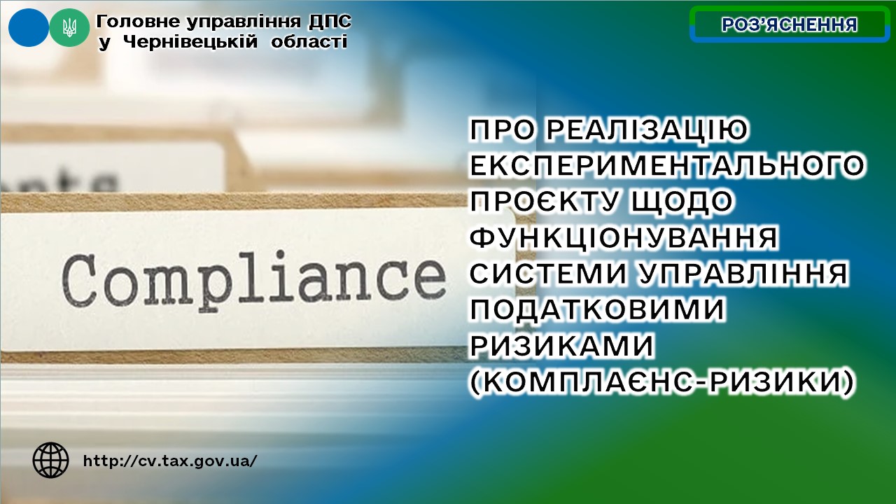 У Головному управлінні ДПС у Чернівецькій області нагадують на виконання Національної стратегії доходів до 2030 року Кабінетом Міністрів України прийнято постанову про реалізацію експериментального проєкту щодо функціонування системи управління податковими ризиками (комплаєнс-ризиками) в Державній податковій службі.